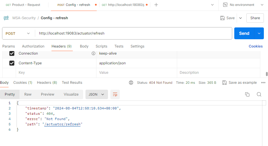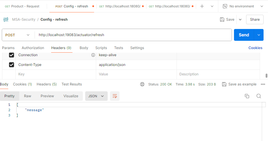 - config 애플리케이션을 재실행시킨 후 'http://localhost:19083/actuator/refresh'에 POST 요청을 보낸다.