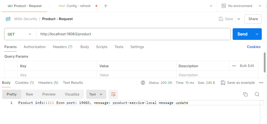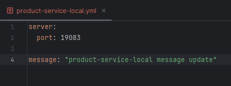 - product-service에서 설정한 port 값 0과 default message 대신 config-service의 config-repo/product-service-local.yml 파일에 설정한 server.port와 message 값이 반환되었음을 확인할 수 있다.