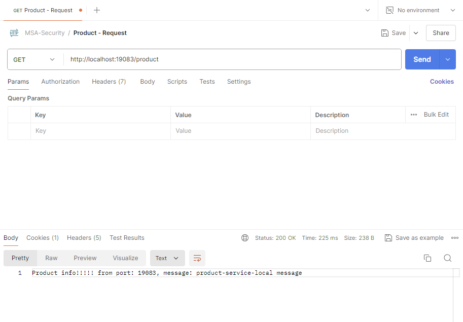 - server, config, product 순서대로 애플리케이션을 실행시킨 후 'http://localhost:19083/product'에 GET 요청을 보낸다.