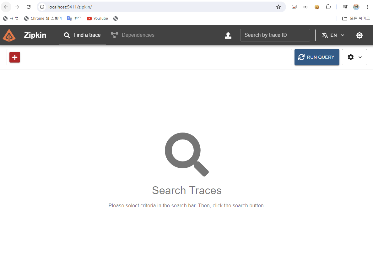 - 브라우저 상에서 'http://localhost:9411/zipkin'에 접속하면 아무 기록이 없는 것을 확인할 수 있다.