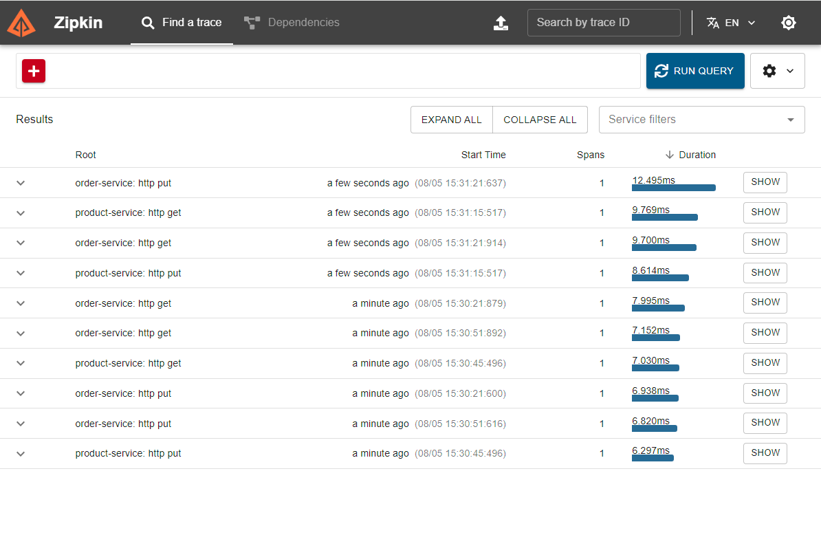 - Zipkin에서 상단의 'RUN QUERY' 버튼을 클릭한다.