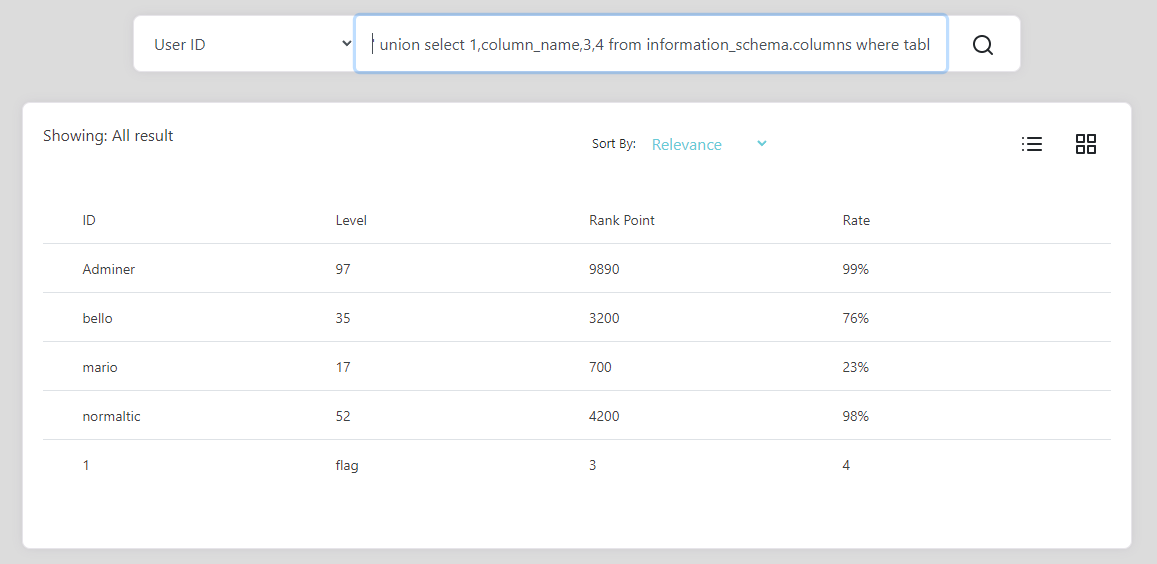 order by 5 는 결과가 뜨지 않으니 컬럼 개수는 4개이다.