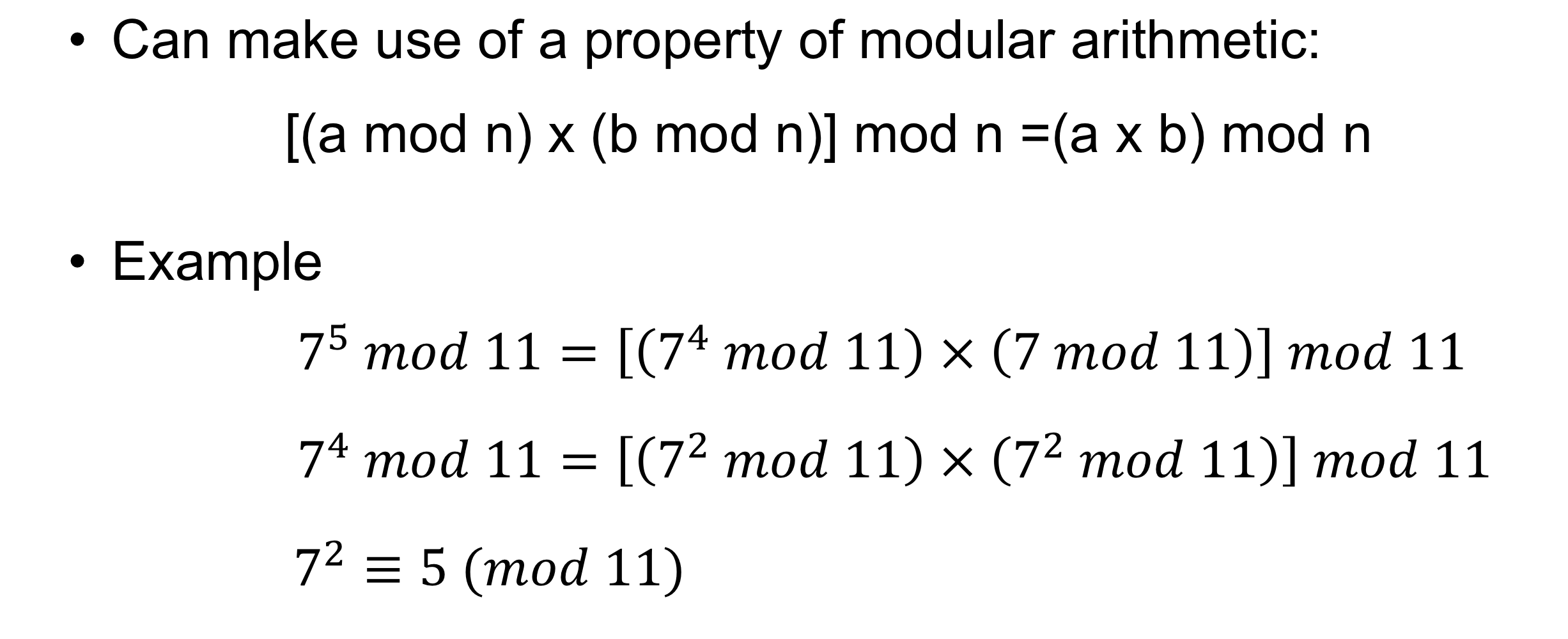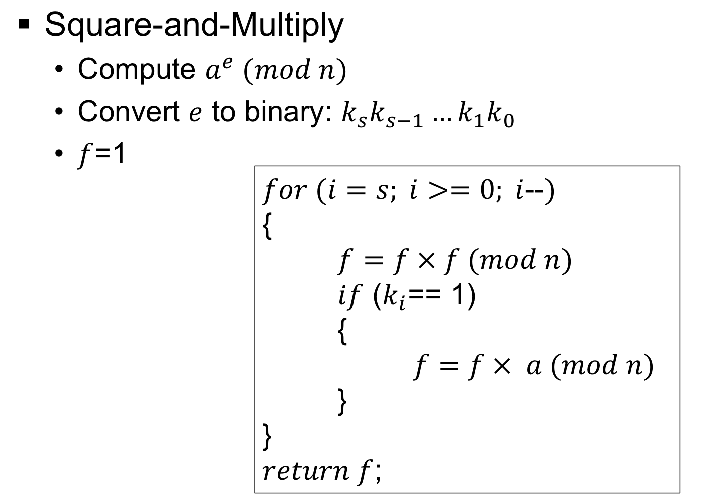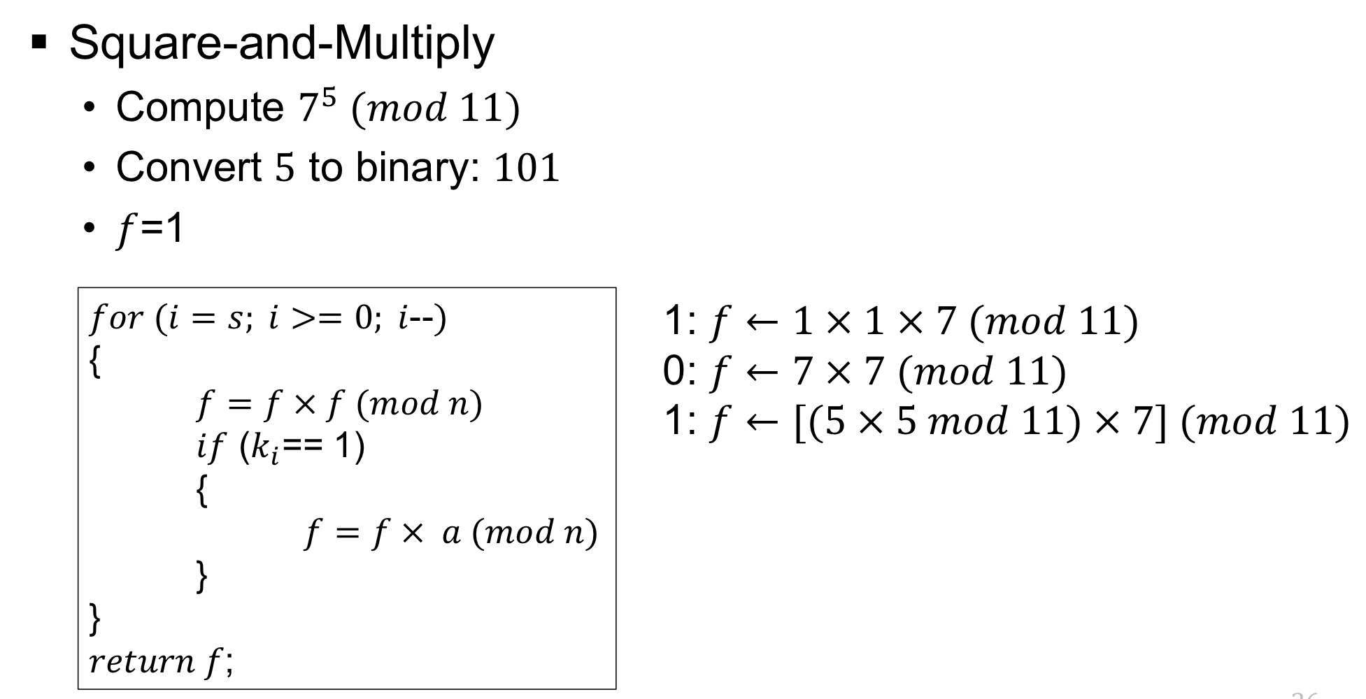 binary값에 따라 1이면 Squre + multiply, 0이면 Square (log n 정도로 효율적)