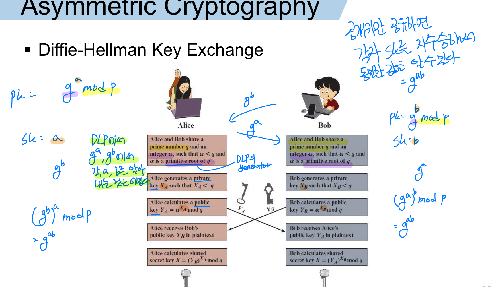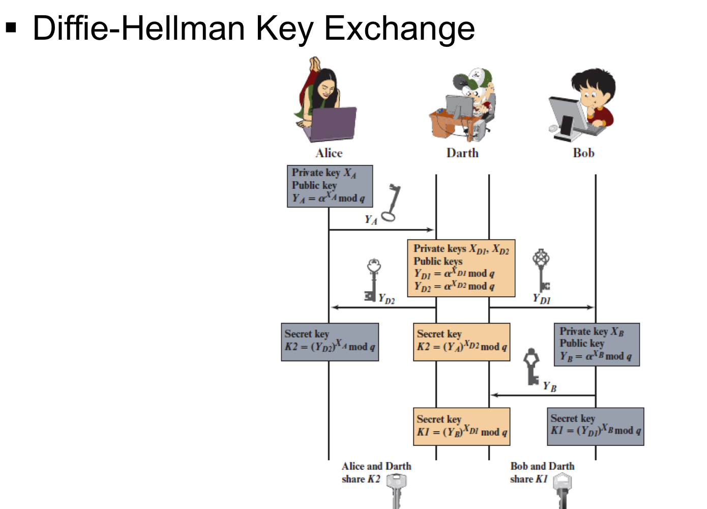 g^a mod p, g^b mod p를 서로 교환해서 각자 알고있는 비밀키로 지수승을해서 공통된 값을 얻어내는게 Diffie-Hellman Key Exchange이다.가장 큰 문제는 Man-in-the-middle Attack(중간자 공격)