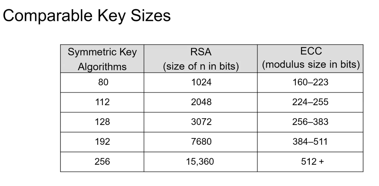 동일한 레벨에 대해 RSA의 경우 모듈러 n사이즈가 7680bit여야 하지만 ECC에서는 384bit만으로도 안전성을 제공할 수 있음.