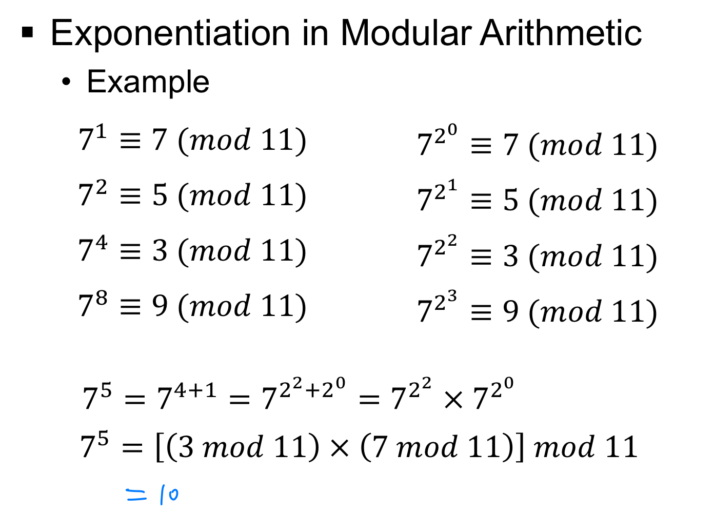 그렇기에 마지막 5 x 5 mod 11 = 5 x 5 = 25, 25 x 7 = 175, 175 mod 11 = 10임