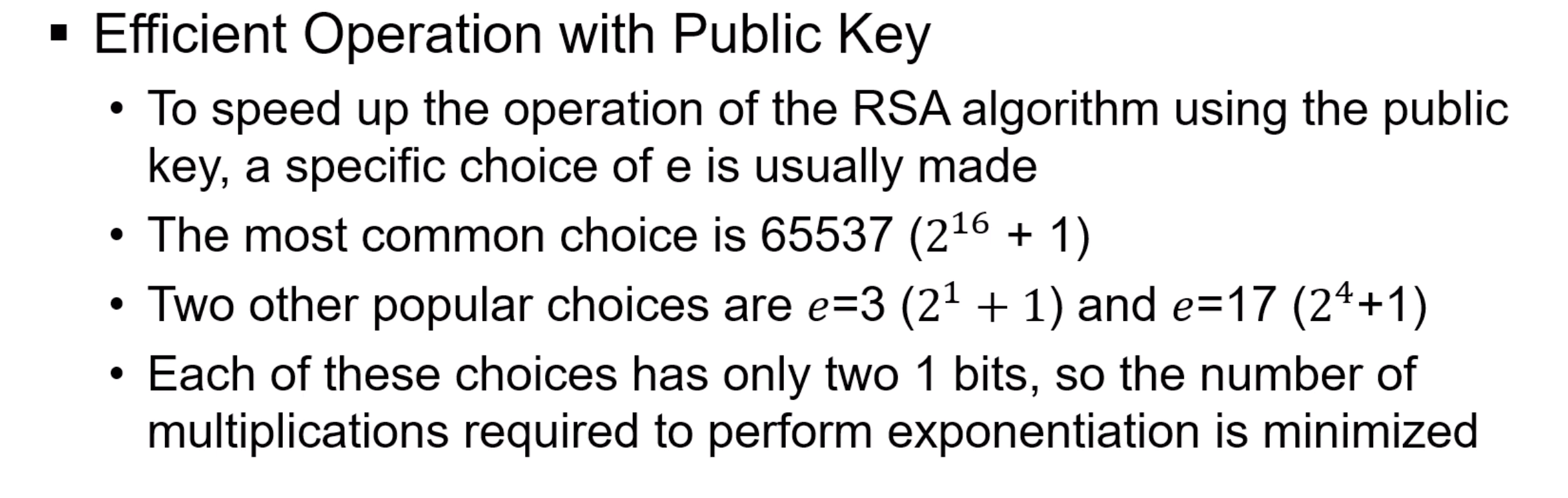 Encryption, decryption 할 때, m^e mod n에서 e를 binary로 변경하고 1은 없는것이 이득이니 공개키를 미리 65537(2^16+1)과 같이 미리 세팅을 한다. 공개키를 먼저 알려주어도 d = e^-1 mod pi(n)으로 pi(n)값을 모르기에 상관이 없다.