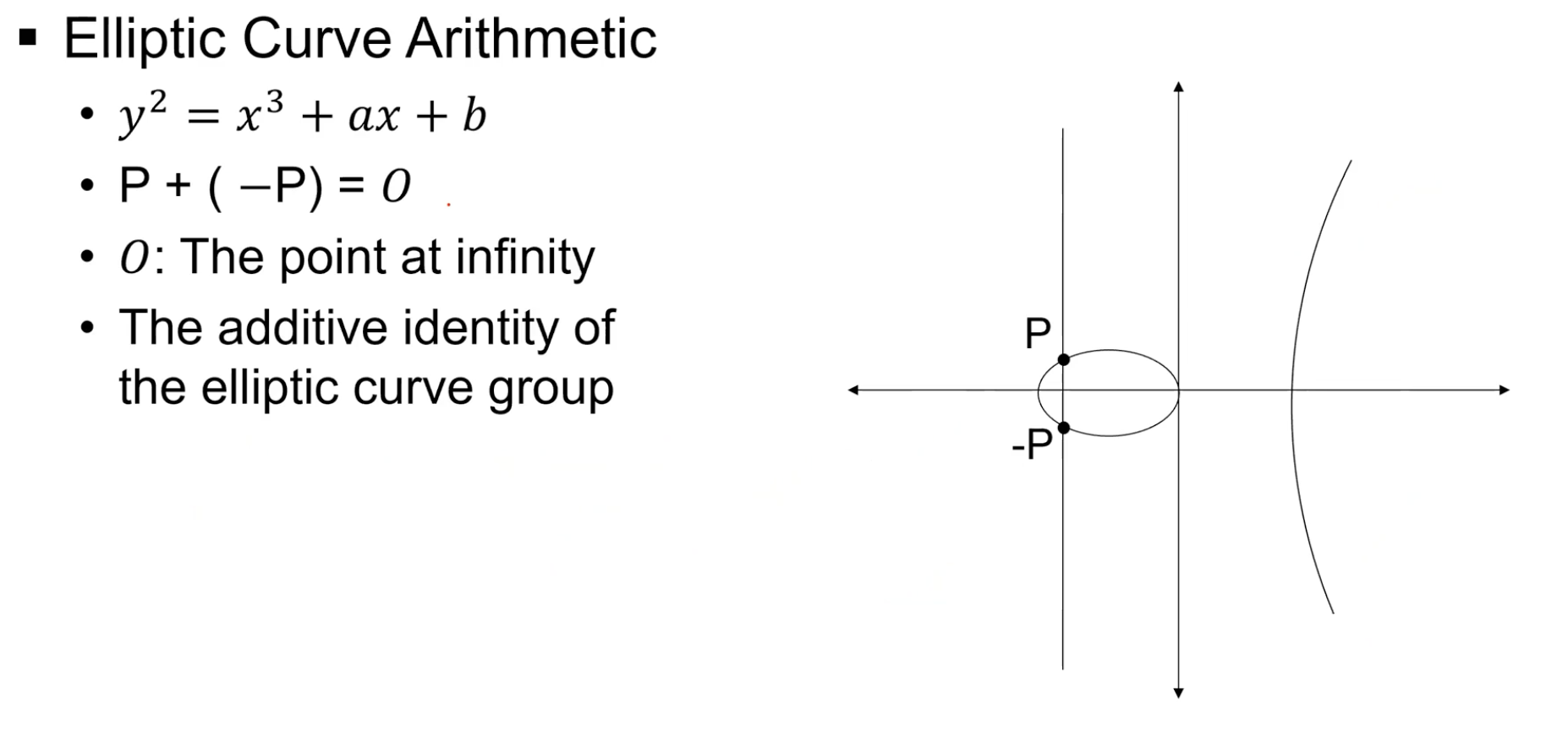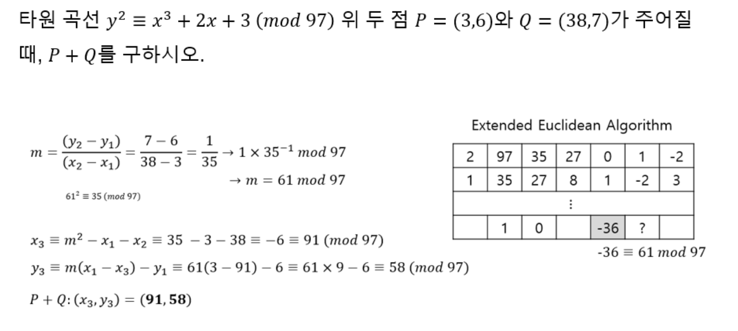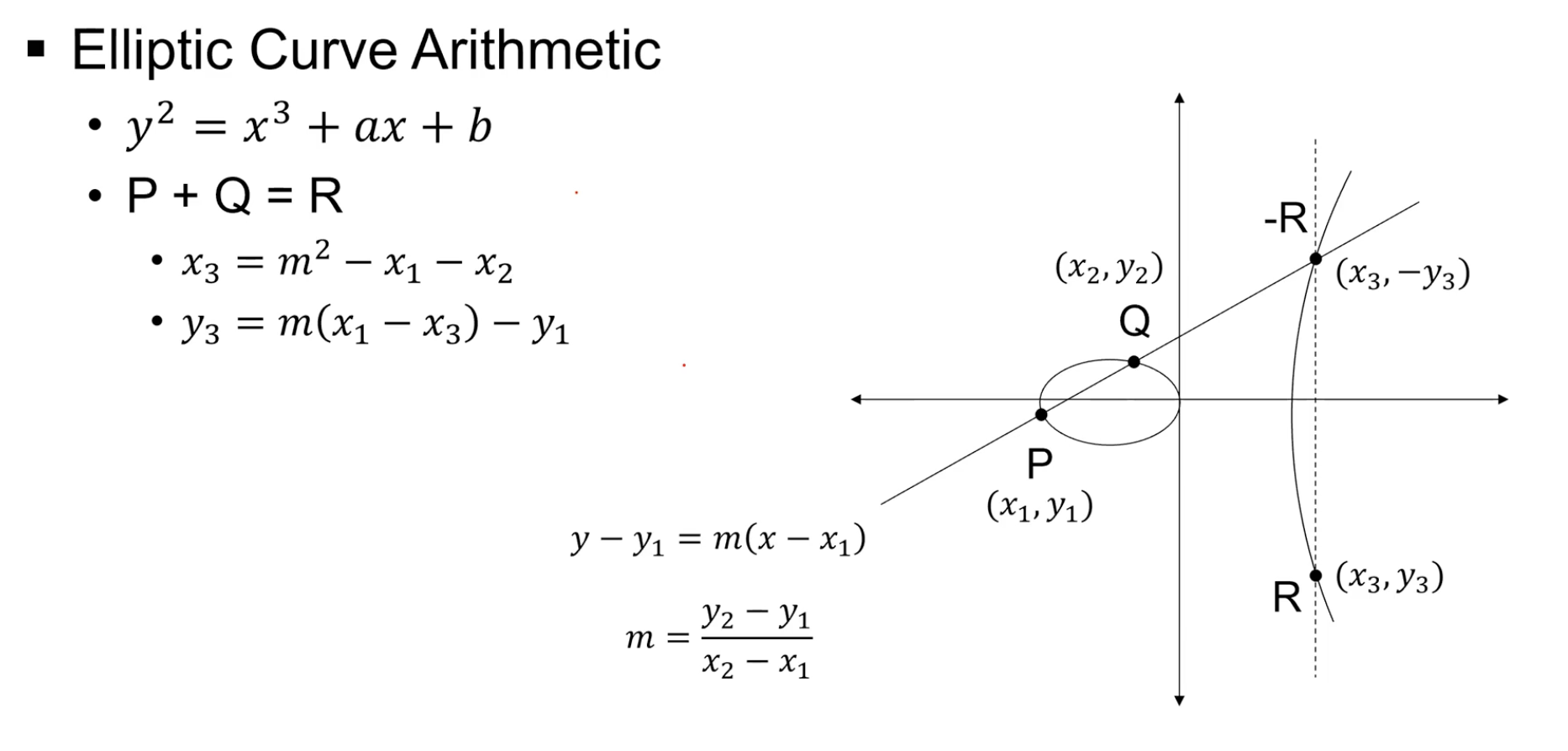 P,Q라는 점이 타원곡선 위에 주어졌을 때, 서로 다른 값에 대해 덧셈연산은 P,Q를 지나는 직선의 방정식을 그어서 만나는 점에 X축 대칭한 것이 P,Q의 연산 결과이다.