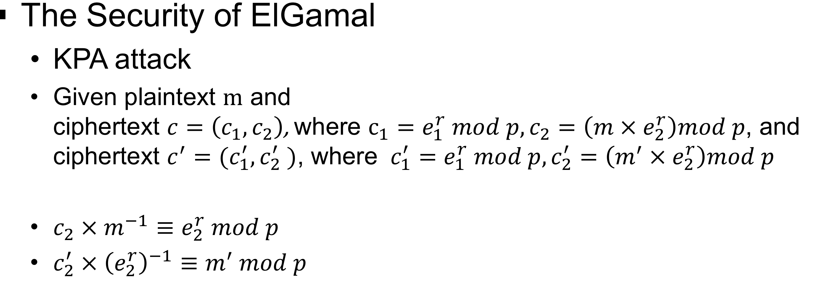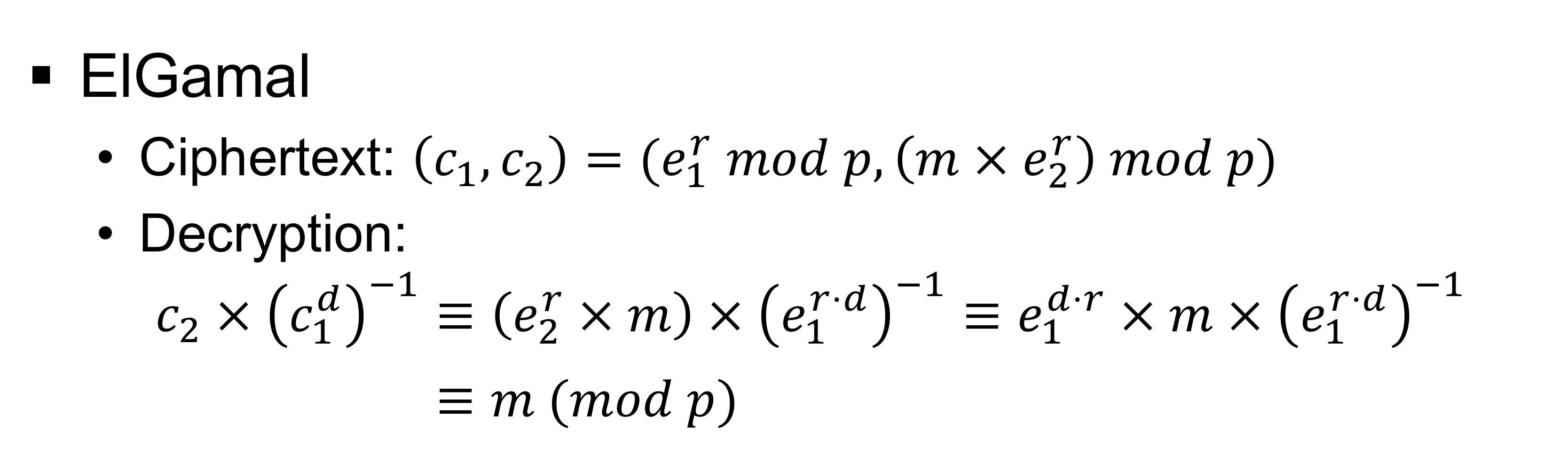 Plaintext m = c2 x (c1^d)^-1 mod p