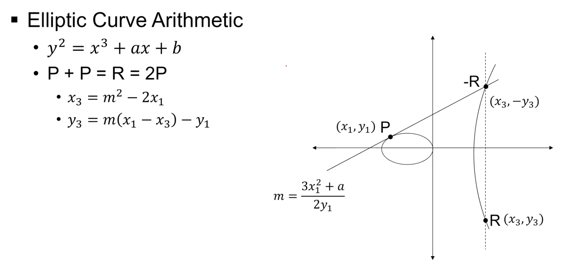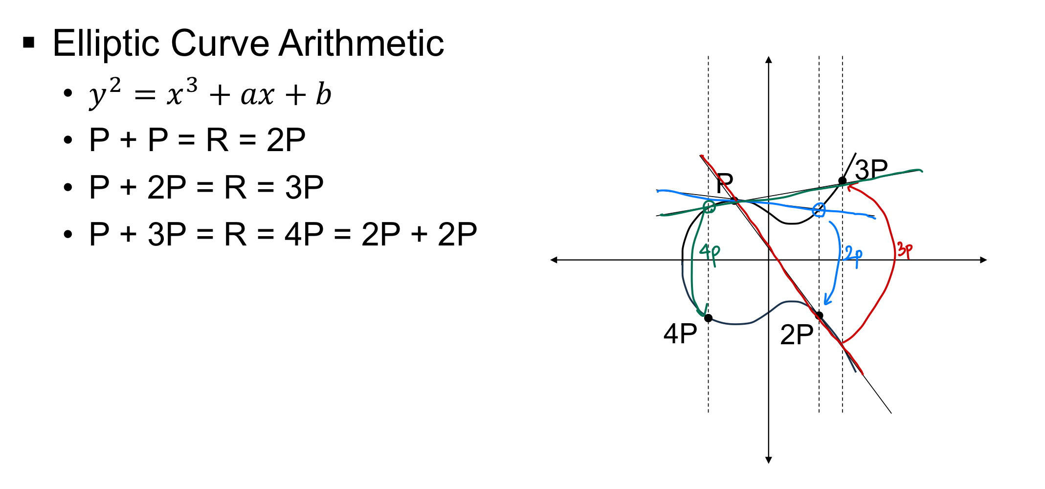 어떠한 점 P가 주어졌을때 10 x P해서 10P를 구하는것이 아닌, P점에서 접선의 방정식을 통해 만나는 점에 X축 대칭, 또 거기서 X축 대칭 ~ 이런 과정을 통해 10P를 구할 수 있다.이것을 point addition에서의 DLP이라고 한다. (Elliptic Curve Discrete Logarithm Problem, ECDLP)