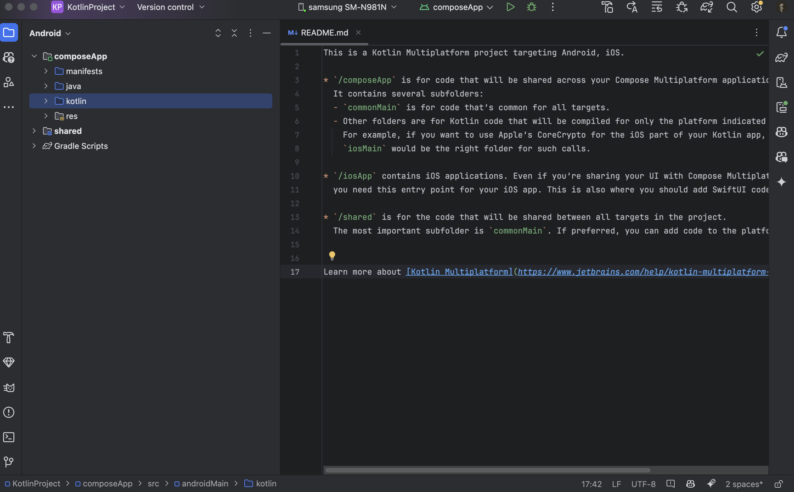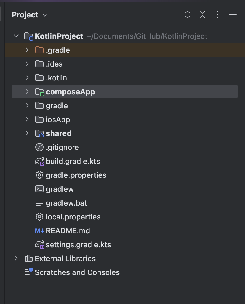 가장 중요한 하위 폴더는 `commonMain`입니다. 원한다면 여기에 플랫폼별 폴더에도 코드를 추가할 수 있습니다.
