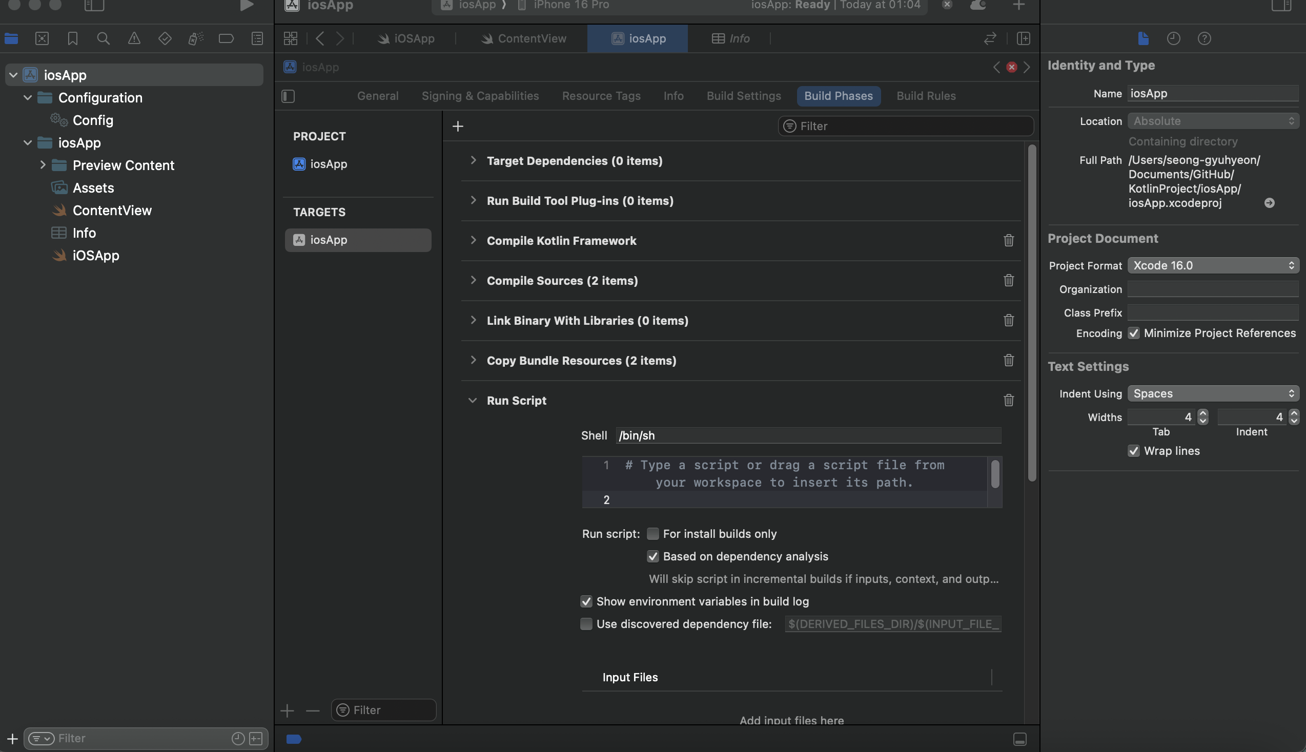 생성된 Run Script 항목을 확장하고 텍스트 필드에 다음 스크립트 넣기.