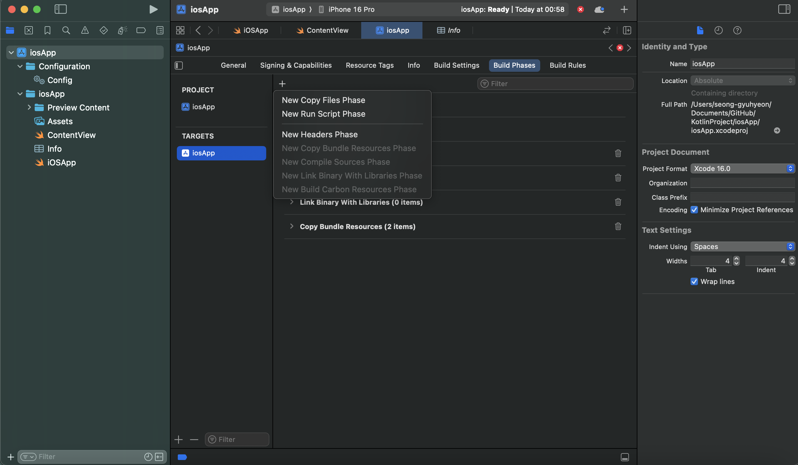 왼쪽 Targets 섹션에서 프로젝트를 선택한 후 Build Phases 탭을 클릭.