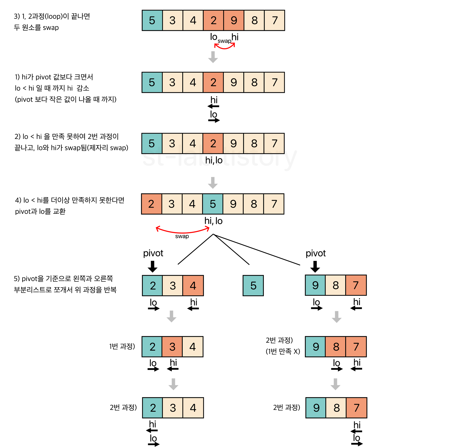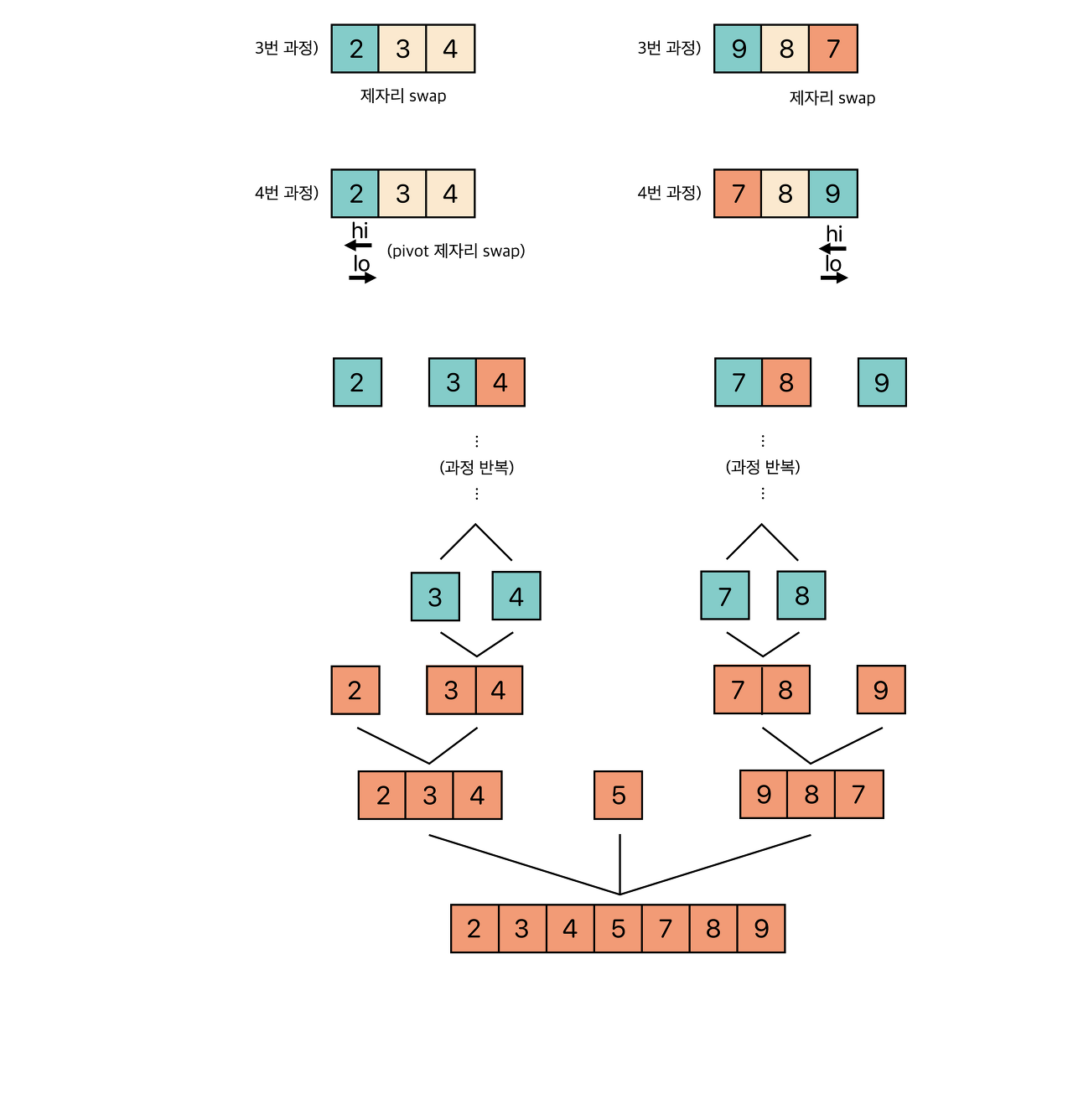 // 이후 해당 피벗을 기준으로 좌, 우를 부분리스트로 나누어 분할-정복을 수행