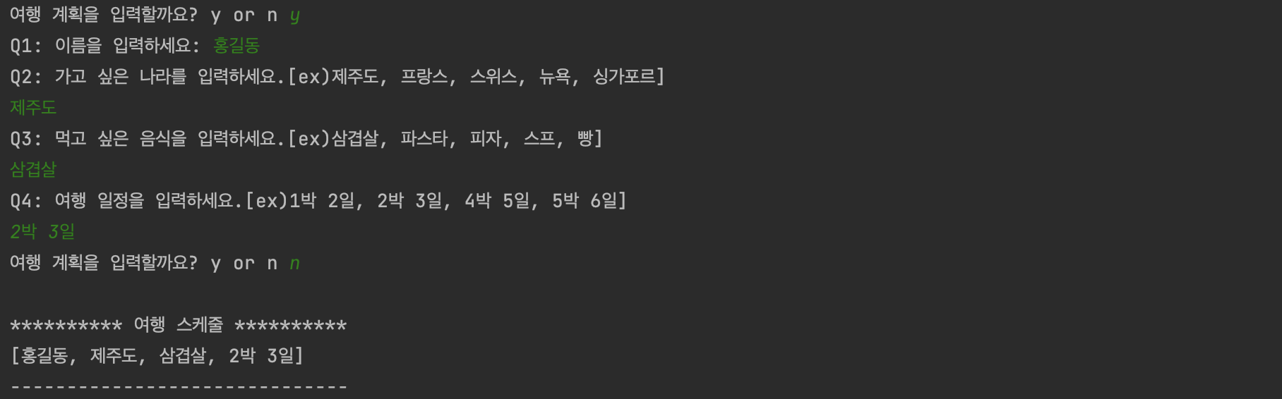 String[] question = {"이름을 입력하세요: ", "가고 싶은 나라를 입력하세요.", "먹고 싶은 음식을 입력하세요.", "여행 일정을 입력하세요."};