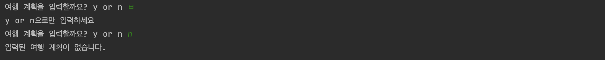 System.out.print("여행 계획을 입력할까요? y or n ");