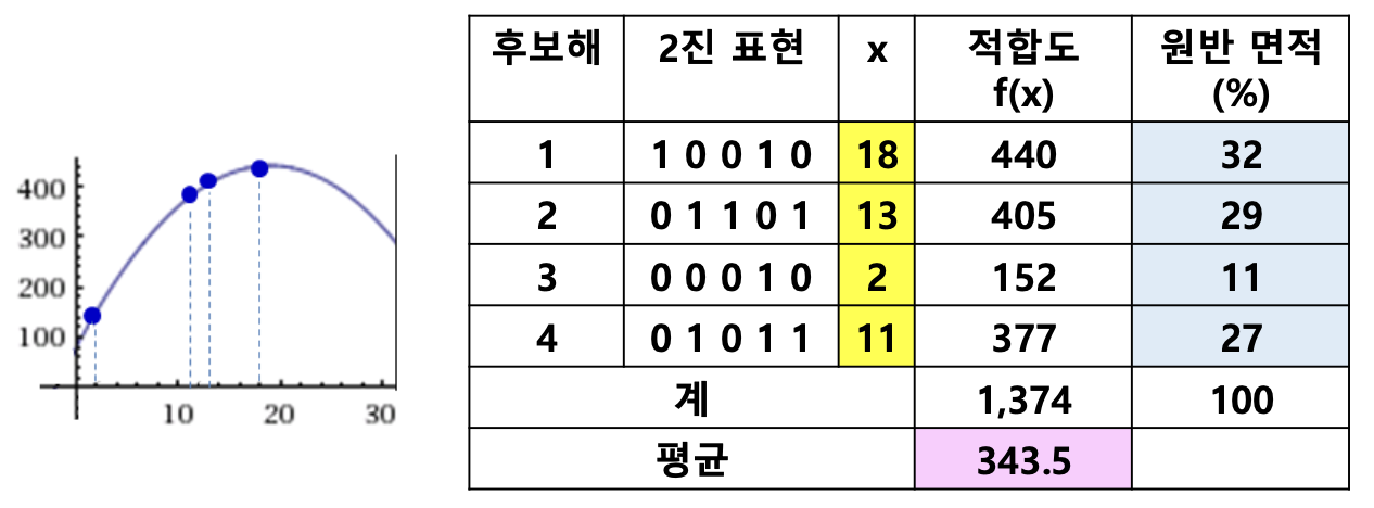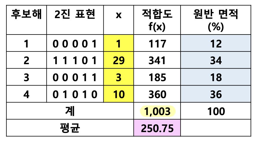 - 이 값을 기준으로 좋은 해/나쁜 해를 구분하고 선택, 교차 확률 등에 사용한다.