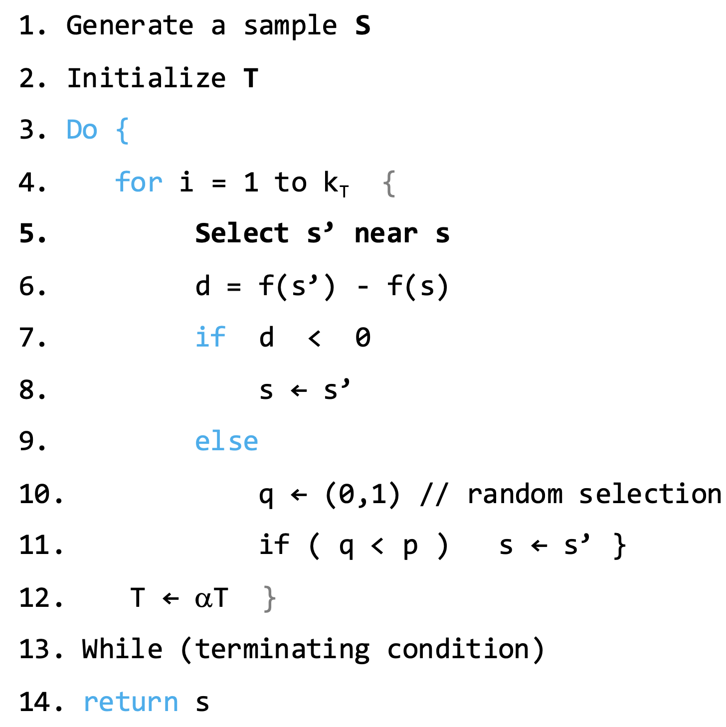 d가 0 이상(같거나 더 나쁜 해)일 때도, 난수 q∈(0,1)와 비교해 q < p이면 그 해로 이동하도록 하여 나쁜 해를 확률적으로 가끔 받아들인다.
