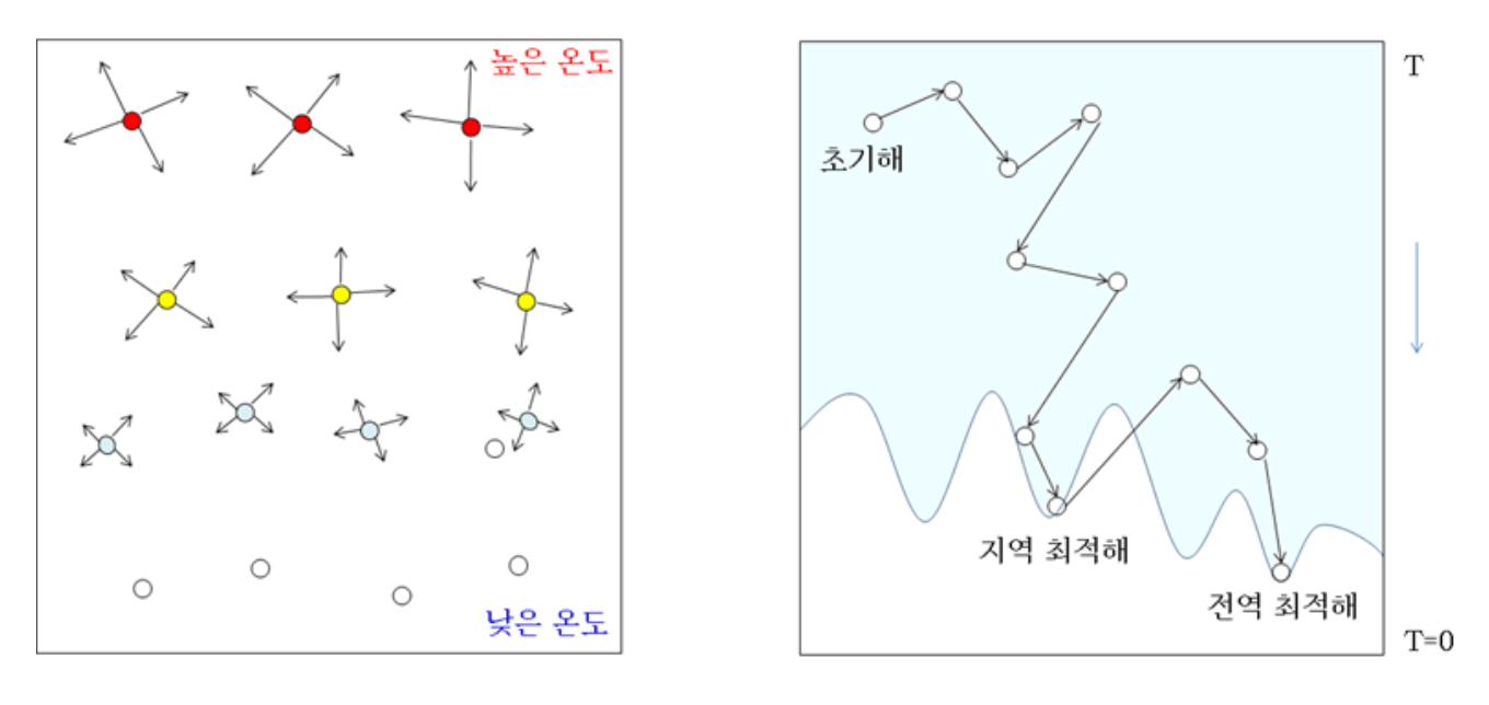 온도 T가 높을 때는 큰 변화도 자주 허용하므로 해가 크게 요동치며 전역 탐색을 시도한다.