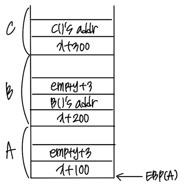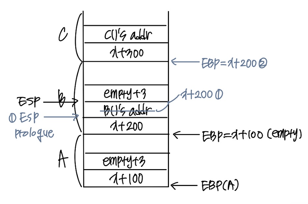 - A()가 끝난 뒤 empty()의 epilogue를 이용해 EBP를 원하는 값으로 설정하고, 그 상태로 B 안으로 진입한다.