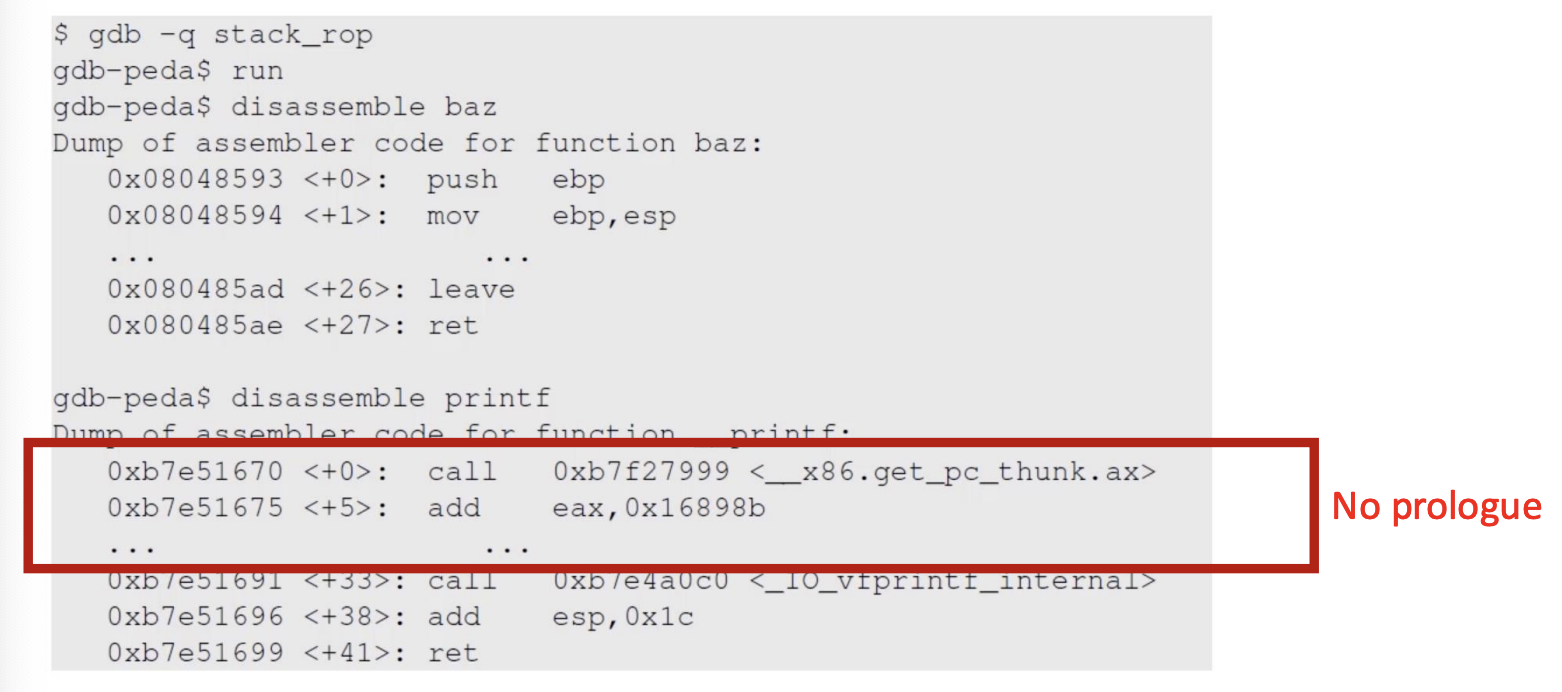 code injection이 아니라 code reuse 공격을 수행하고자 할 때 문제를 일으킬 수 있다. 실제 prinf의 machine code의 ~0x670 주소에서 시작되는데 prologue 없이 다음 함수 호출로 바로 넘어가고 있다.