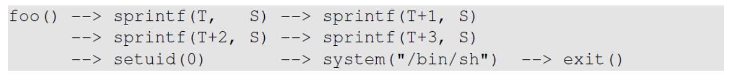- Sequence of function calls (T is the address of the zero): use 4 sprintf() to change setuid()'s argument to zero, before the setuid function is invoked