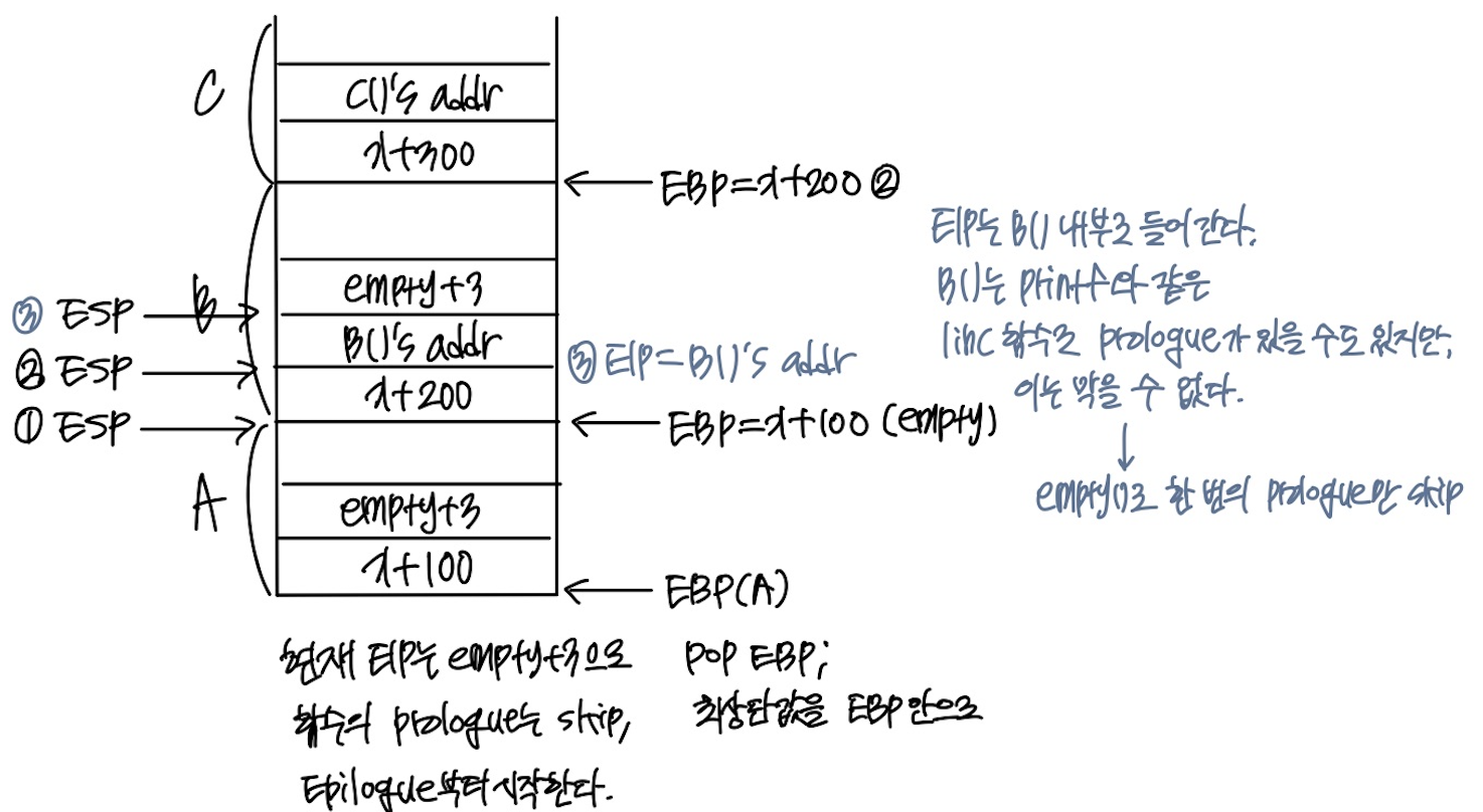 - 함수 A에서 EBP가 X일 때 리턴 주소를 empty로 바꾸고, empty의 prologue를 건너뛰기 위해 리턴 주소를 empty+3(epilogue)로 설정한다.