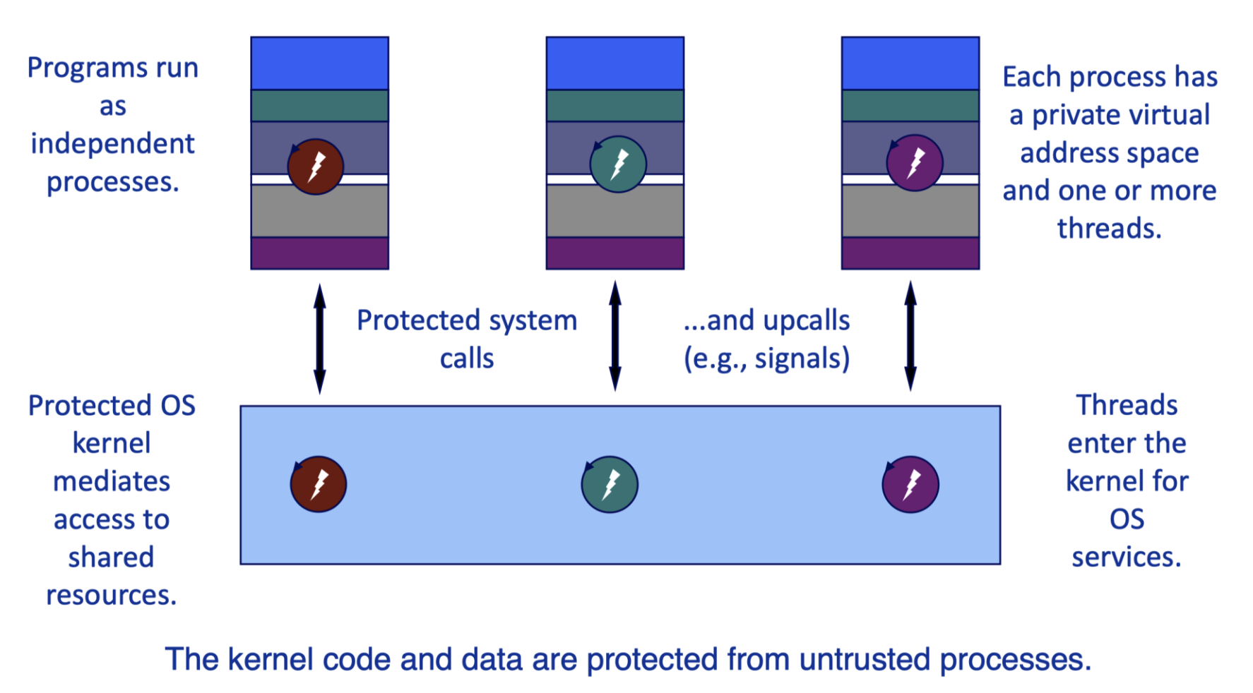 - Modern hardware has features that allow the OS kernel to protect itself from untrusted user code