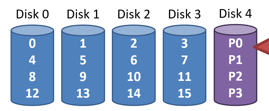 - Reads parallelize over all but the parity drive