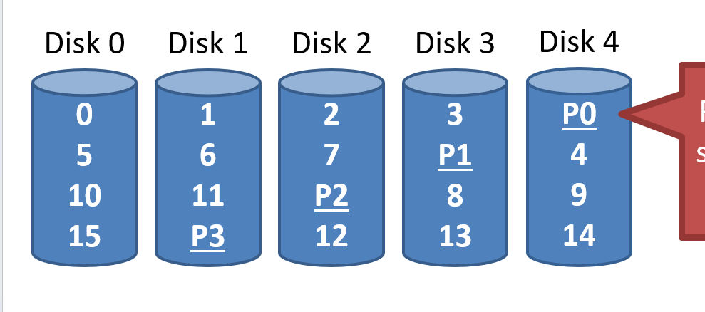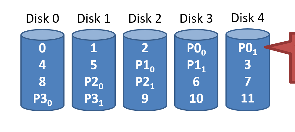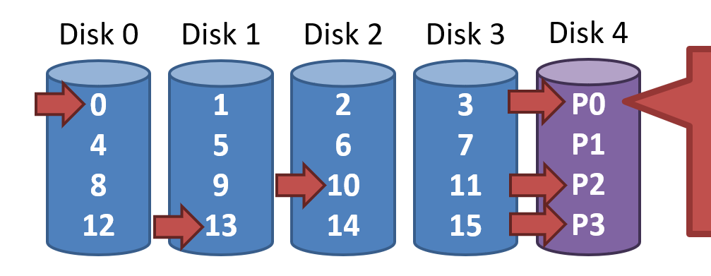 - Unlike RAID 4, writes parallelize over all drives