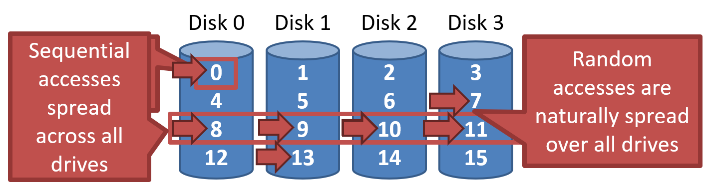 - Random accesses are naturally spread over all drives