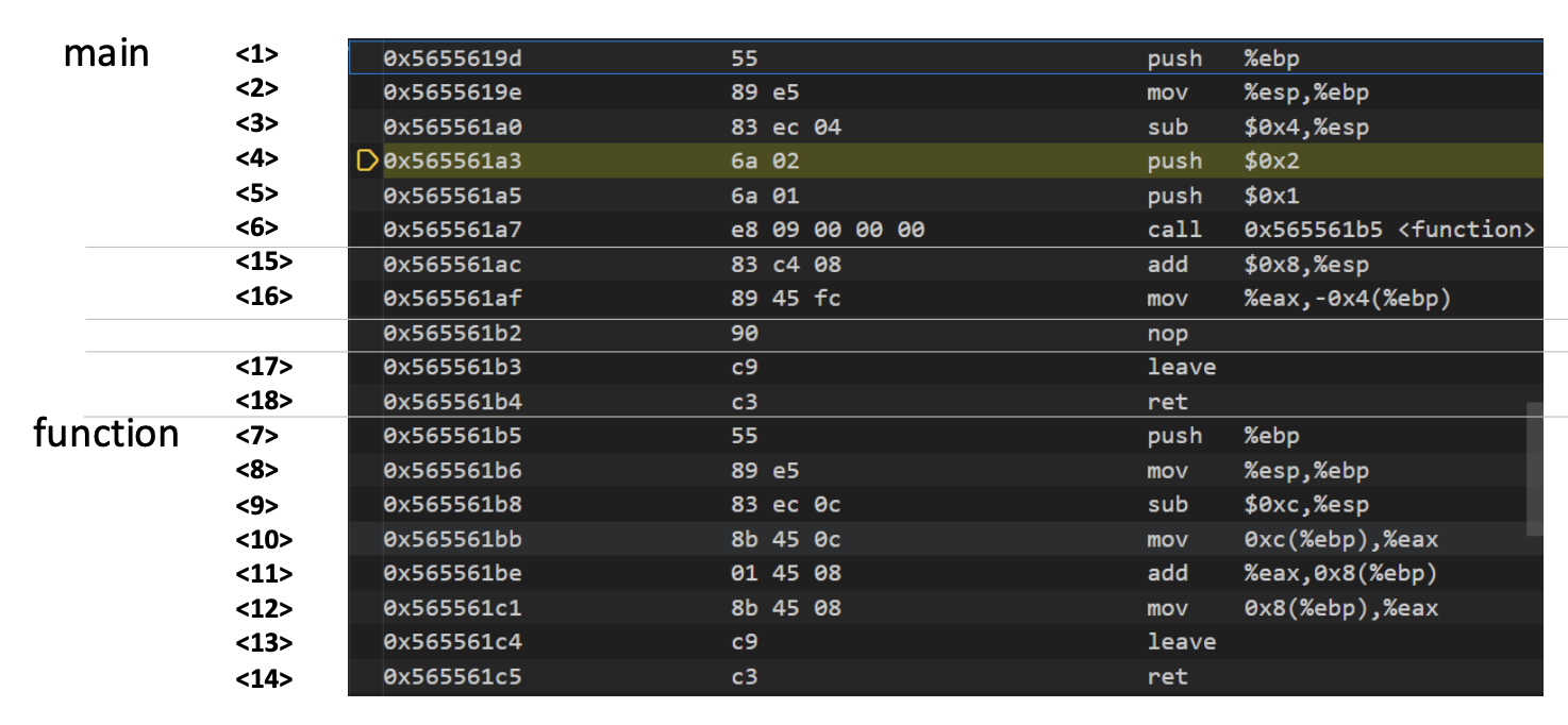 <8> mov %esp, %ebp: function(1, 2)의 prologue