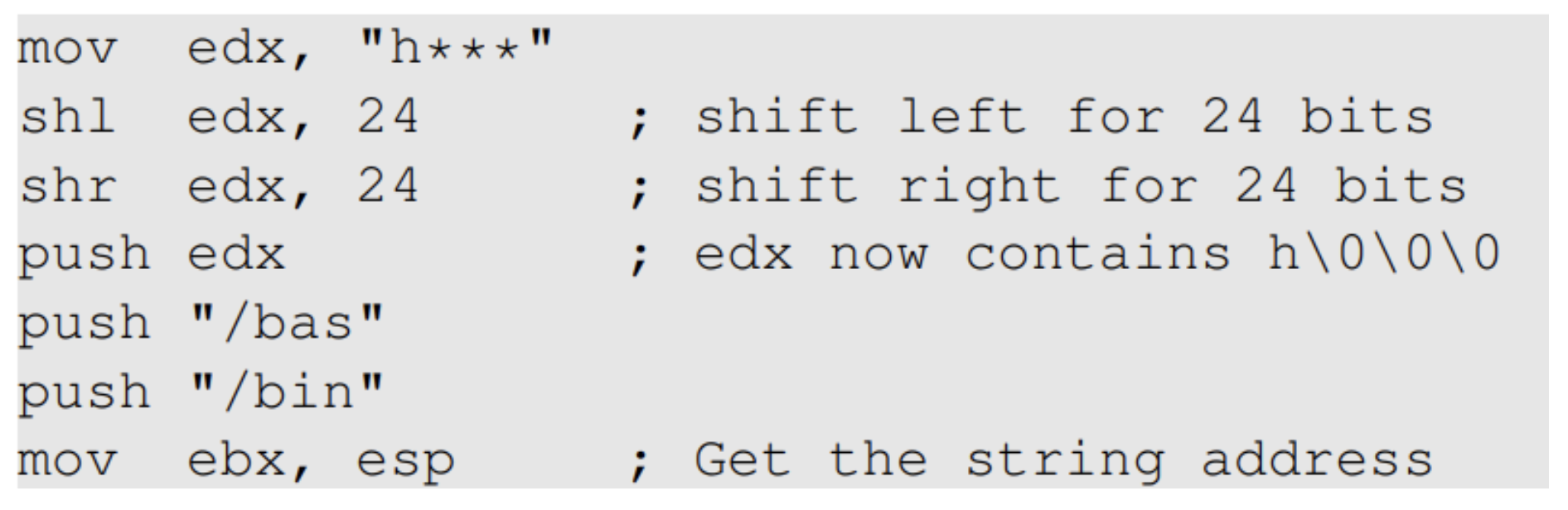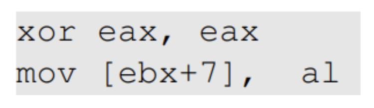 - ebx가 "/bin/sh*" 문자열의 시작 주소를 가리키고 있다고 가정할 때, 7번째 byte에 NULL을 쓴다.