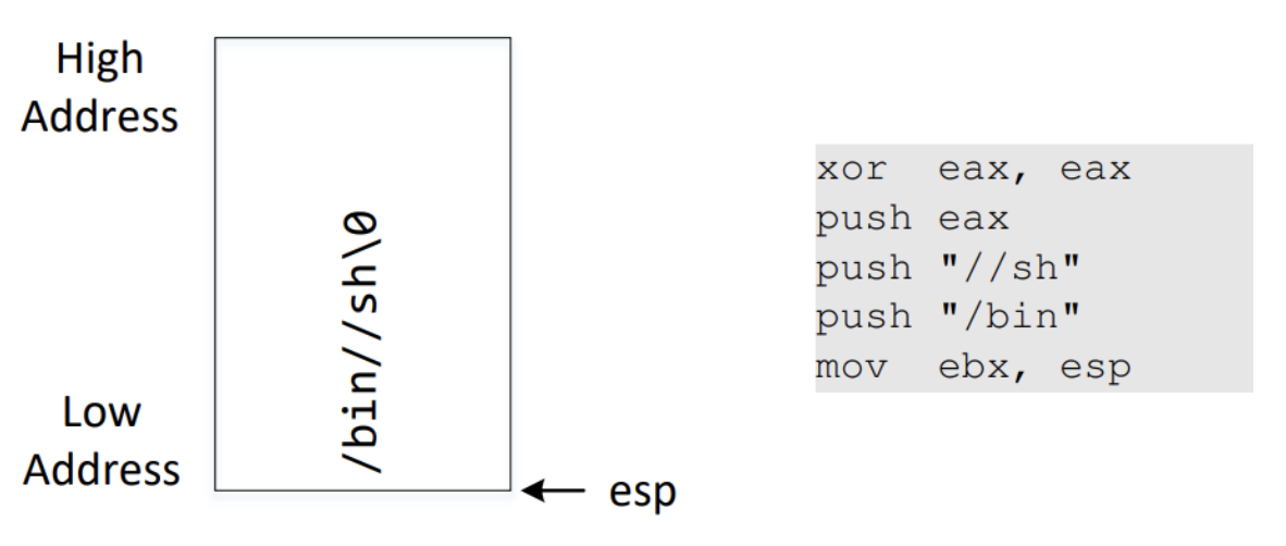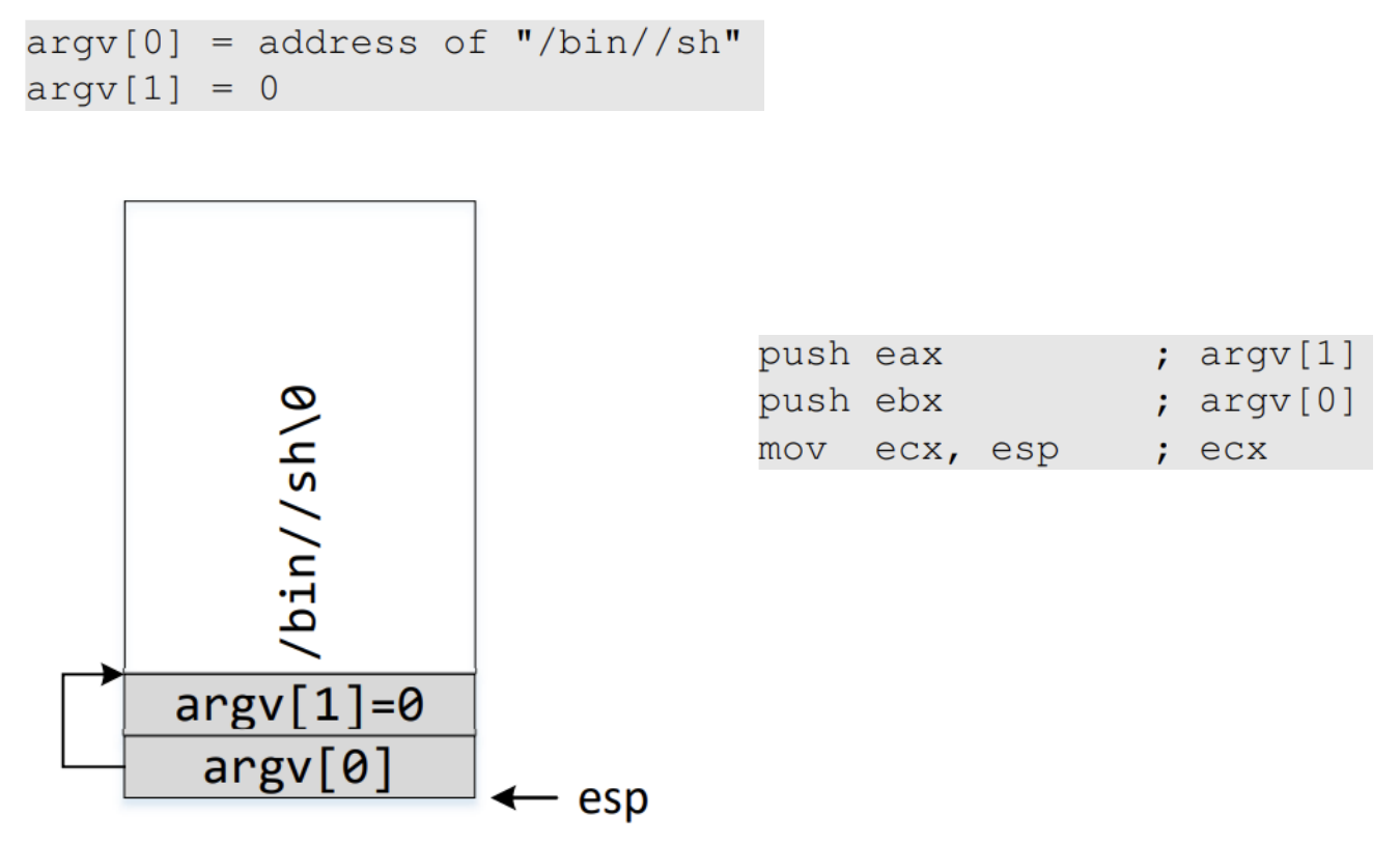 - mov ebx, esp: ebx가 /bin/sh의 시작 주소와 같아진다.