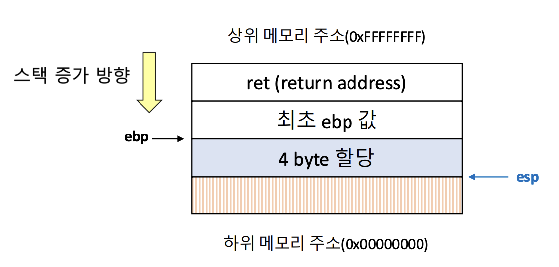 - 4 byte 변수이므로 stack이 아래로 4 byte 내려감