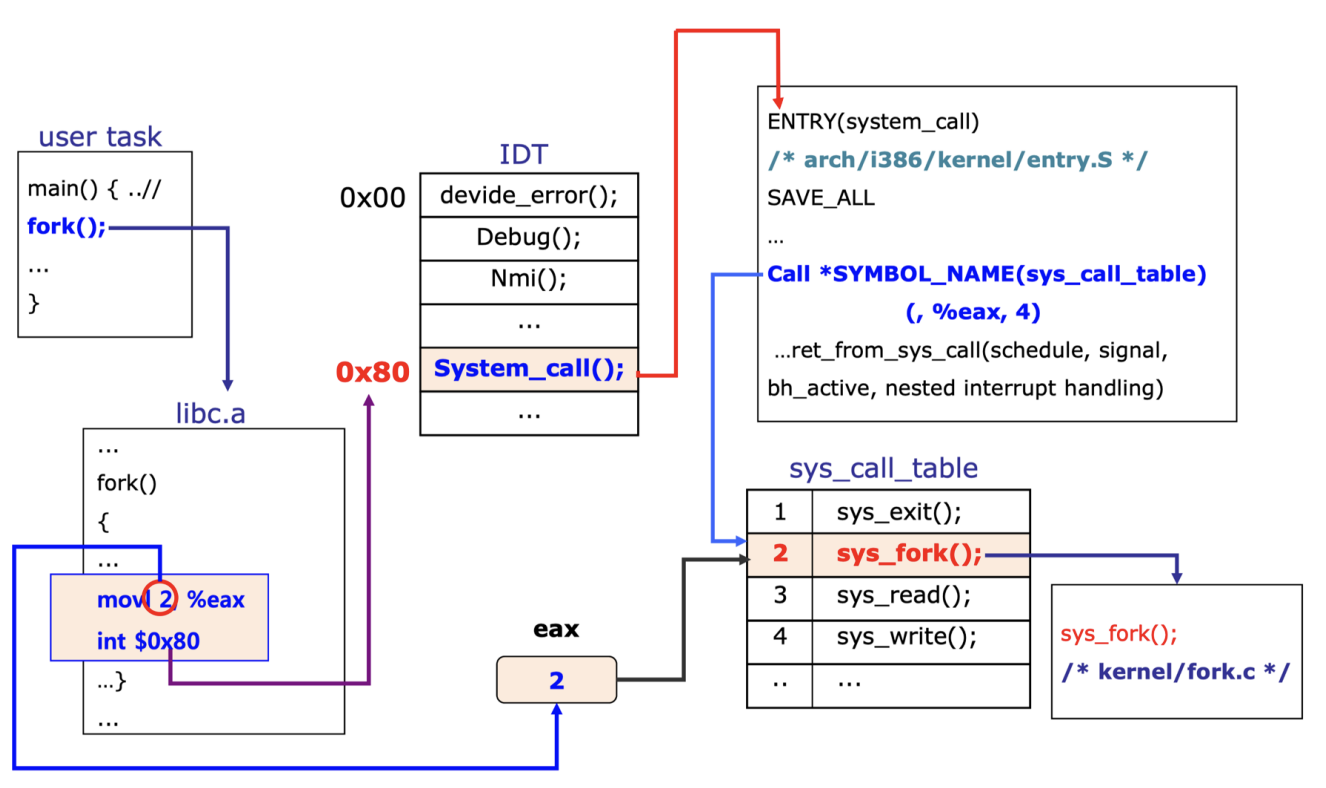 eax, ebx, ecx, edx 등에 필요한 값들을 채워놓고, int 0x80을 실행하면 커널이 해당 system call을 처리한다.
