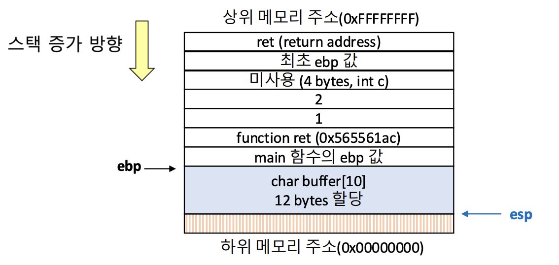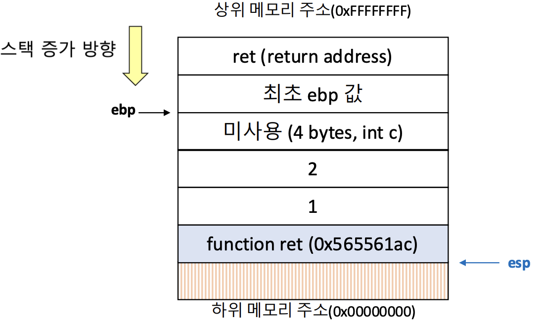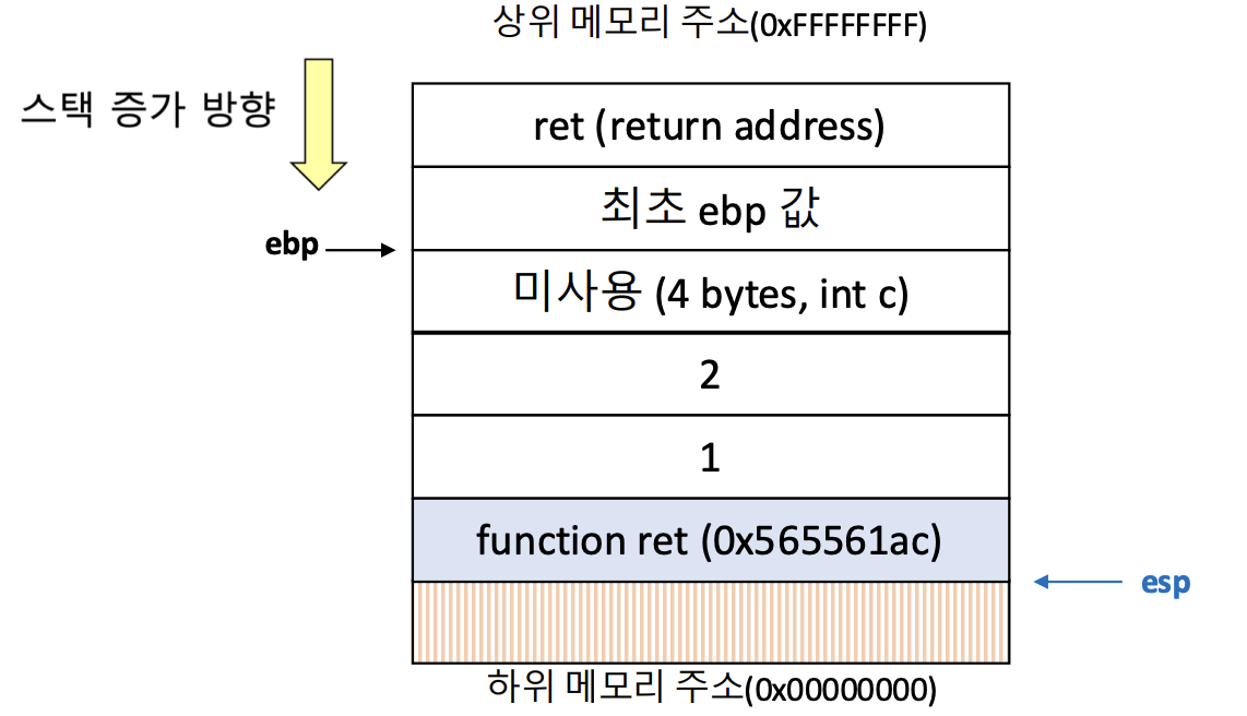 - 위 그림에서 function ret(0x565561ac)가 pop되어 eip에 들어가고, esp는 4 byte 위로 올라간다.