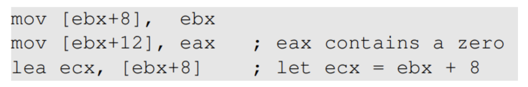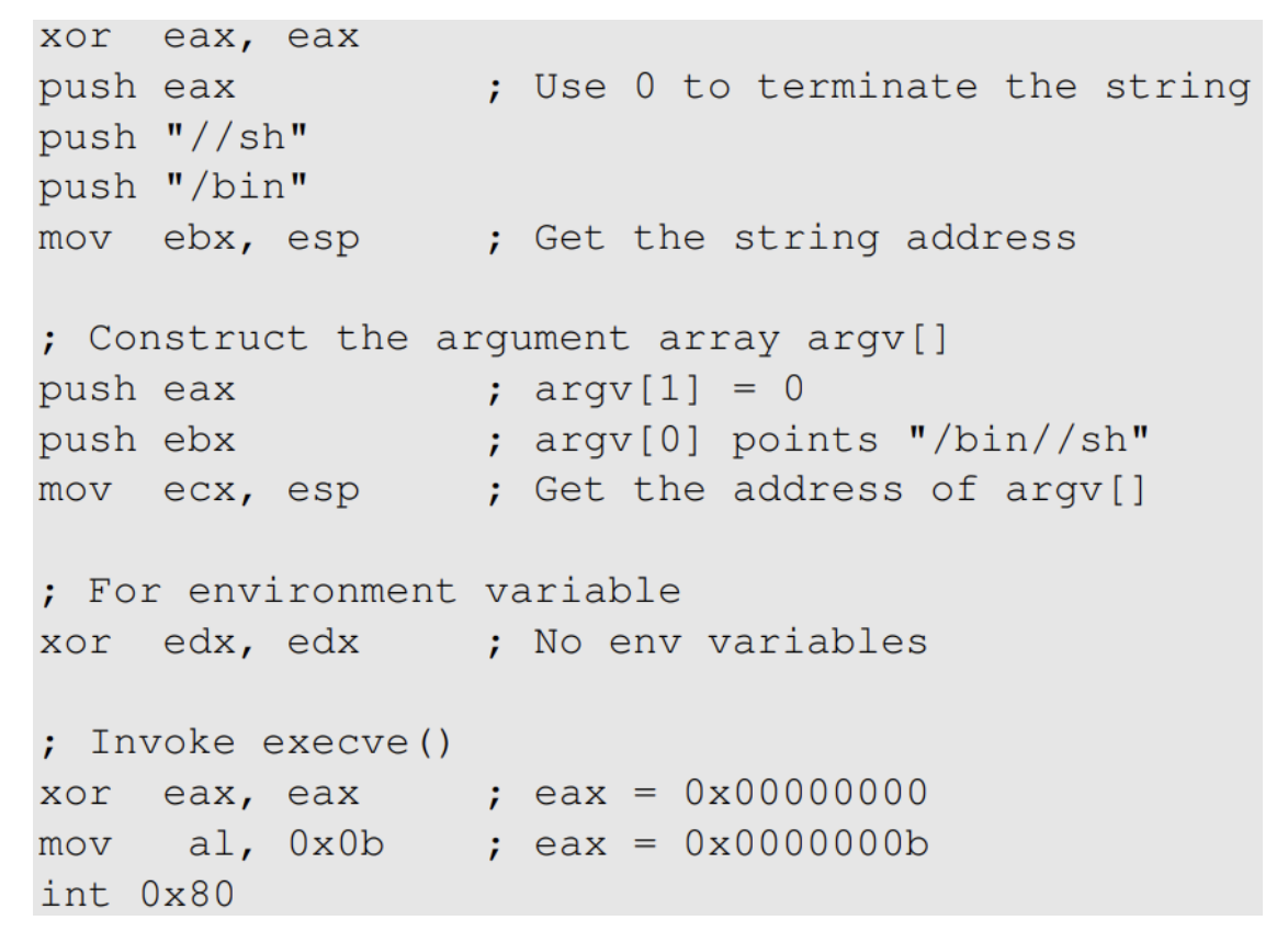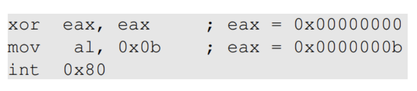 - ebx가 "/bin/sh"을 문자열이 위치한 메모리 주소를 가리킴