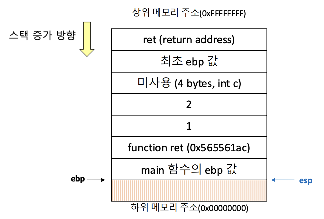 - 스택에서 main 함수의 ebp 값은 '최초 ebp 값'이므로 ebp가 저 위치를 가리키게 된다.