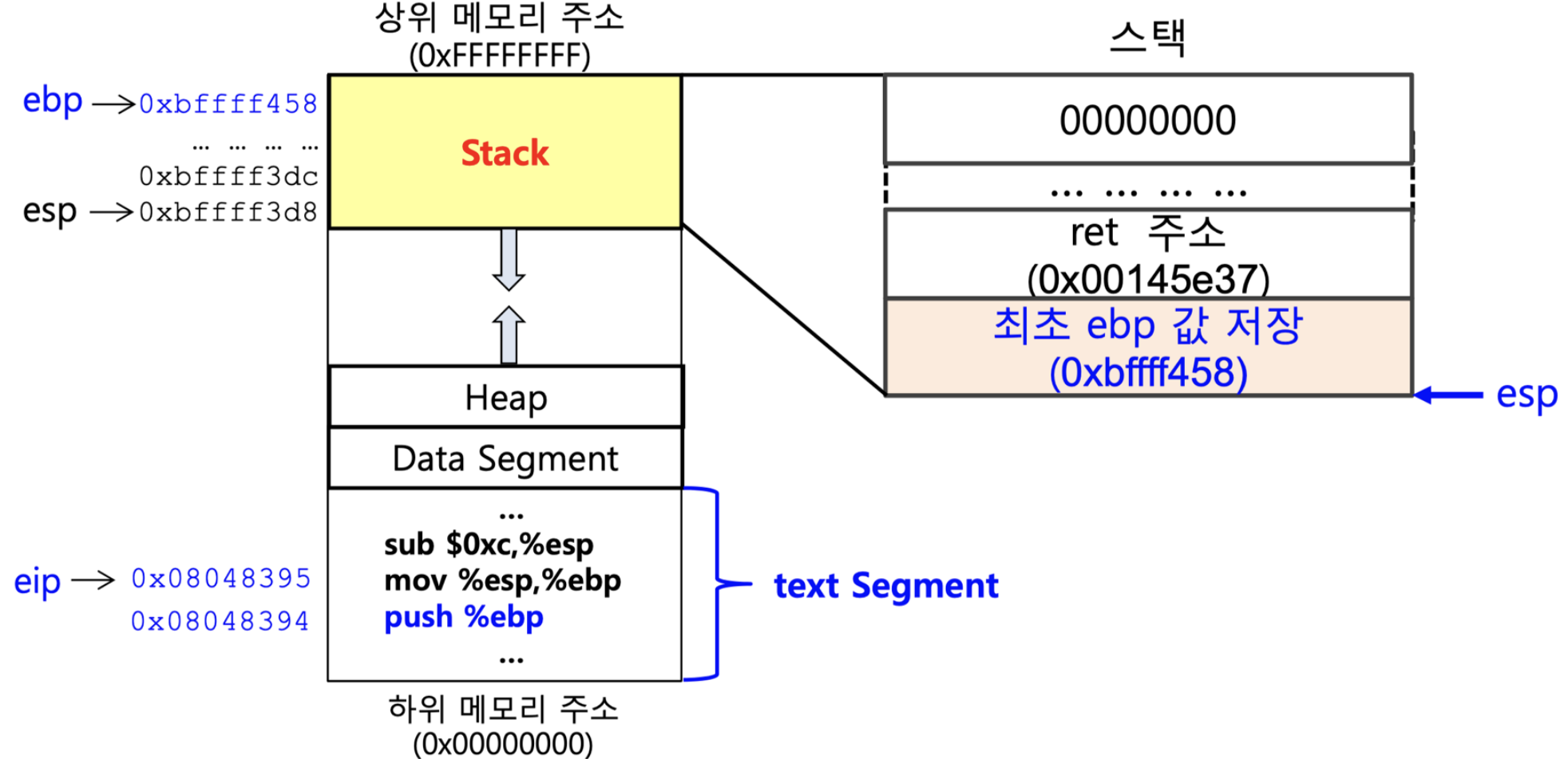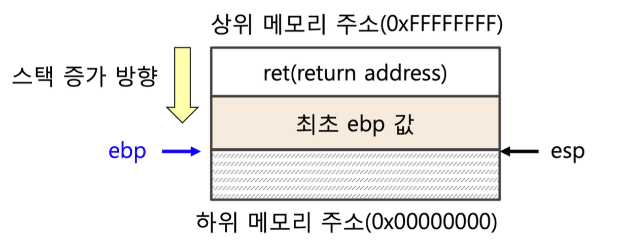 - 최초의 ebp 값이 ebp 레지스터 안에 들어가게 되고, esp는 ret를 가리키게 된다.
