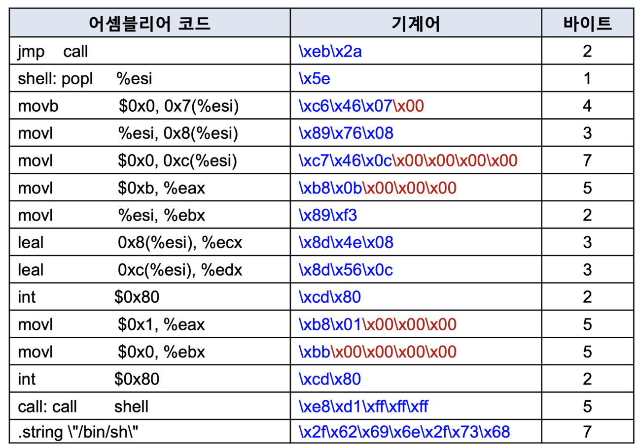 Shell을 띄우는 기계어 코드로, 공격자가 shell을 얻으면 OS에서 거의 모든 명령을 실행할 수 있다.