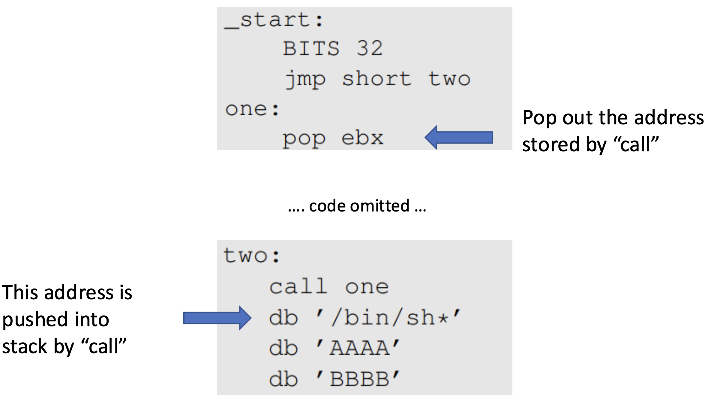 - CALL 명령은 현재의 다음 명령어 주소('/bin/sh*')를 스택에 push하고 eip를 변경