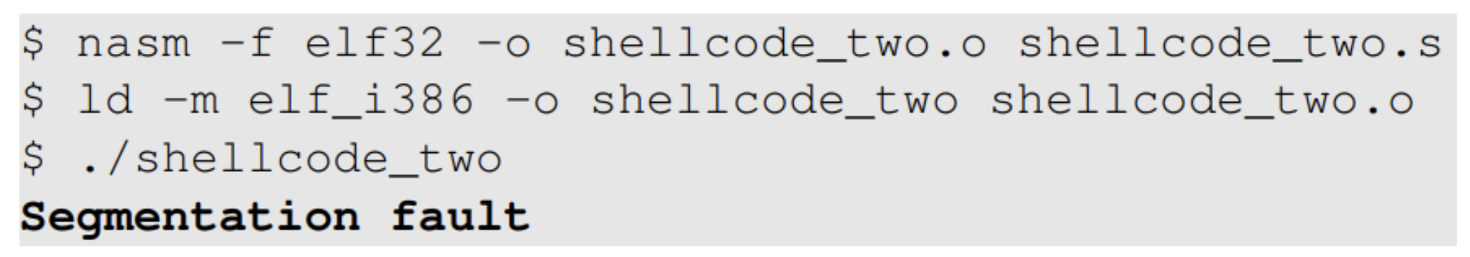 앞서 설명했듯이 NULL byte가 포함되면 이후 injection에서 문자열의 끝으로 인식되어 shellcode가 제대로 동작하지 않으므로, NULL byte는 피해야 한다.