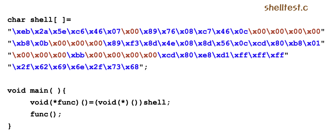 - shell 배열의 시작 주소를 함수 포인터로 type casting하여(void(*)) func에 할당