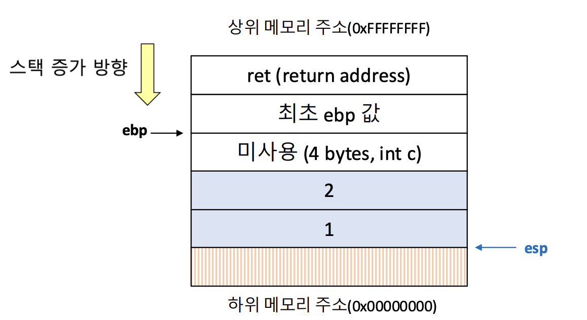 지역변수 c를 위한 4 byte 공간이 스택에 할당되는 상황이다.