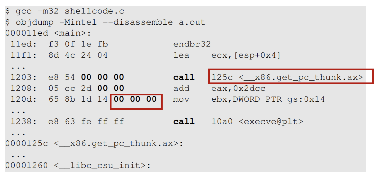 - 'objdump -Mintel --disassemble a.out'으로 바이너리 파일을 disassembling하여 실제 실행되는 기계어 확인