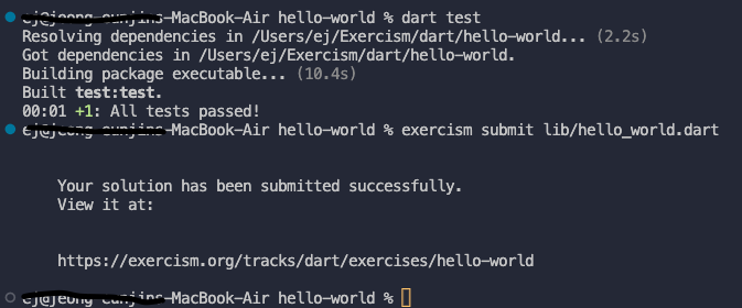 마지막으로 명령어를 넣어 문제를 제출한다.exercism submit lib/hello_world.dart