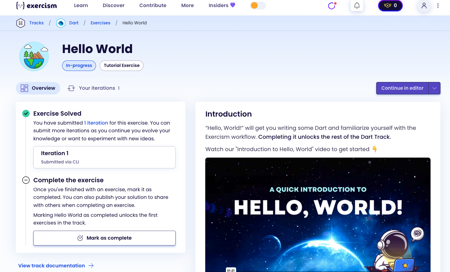 exercism에 다시 들어가보면 화면이 새로고침 되면서 "Exercise Solved"로 바뀐 걸 확인할 수 있다.