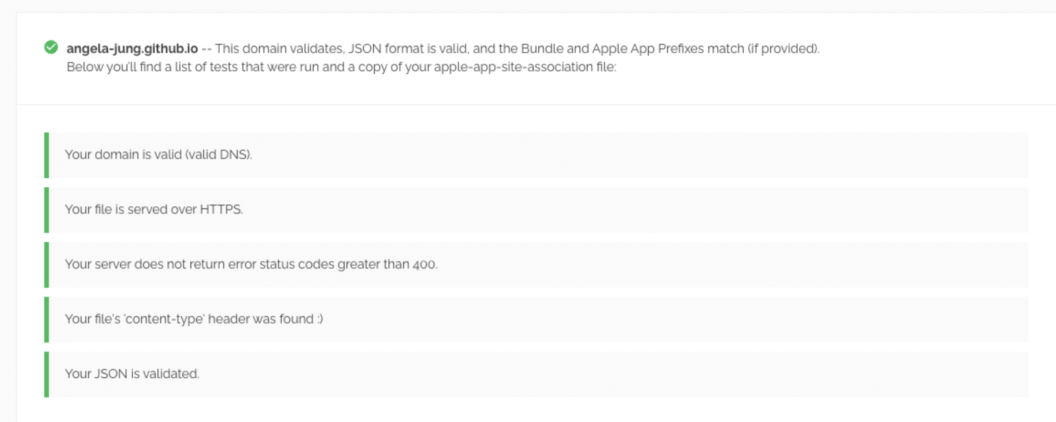 내가 생성한 AASA 파일에 문제가 없는지 체크를 할 수 있는 사이트에요. 만약 문제가 있다면 아래 이미지처럼 어떤 부분에 문제가 있는지 확인할 수 있어요.