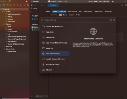 1) Ruuner → Signing & Capabilities로 이동하여 Associated Domains를 클릭합니다.
